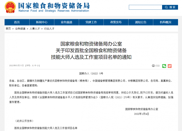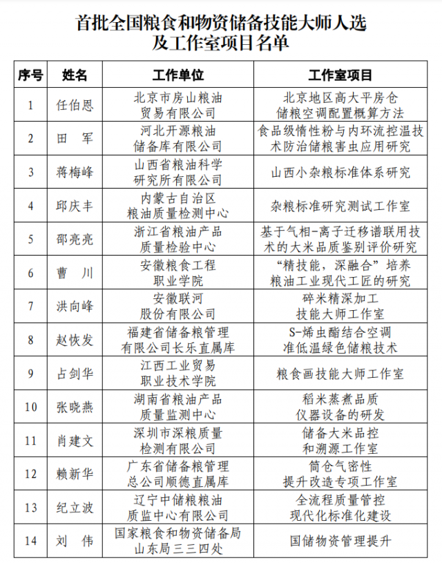 近日,国家粮食和物资储备局发布《关于印发首批全国粮食和物资储备技能大师人选及工作室项目名单的通知》(国粮办人〔2022〕5号),我院占剑华老师荣获“首批全国粮食和物资储备技能大师及工作室”,此次评选,经组织推荐、资格审核、专家评审,国家粮食和物资储备局党组审核同意,并经公示无异议,全国共遴选确定了首批14个技能大师及工作室。